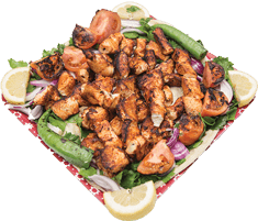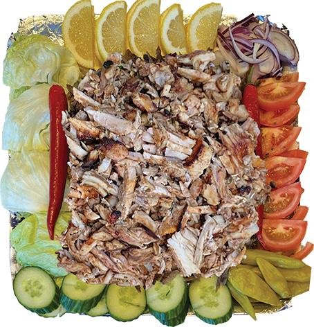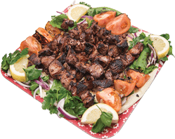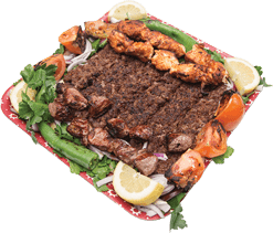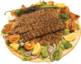 5 spett lammfärs 3 spett kyckling 2 spett lammkött Serveras med grillade tomater, persilja, citron, lök, grillad paprika, tunnbröd