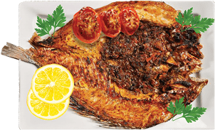 Grillad fisk serveras med grillade tomater, persilja, citron, lök, tanuri bröd.